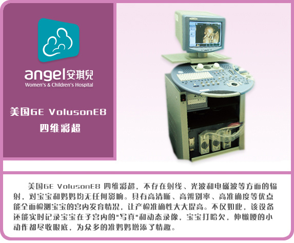 安琪儿斥巨资引进了美国GE Voluson E8四维彩超和Voluson730专家版四维彩超,为孕妈妈和宝宝提供了资深的健康保障。美国GE Voluson E8四维彩超利用二维原理观测胎儿的组织结构,测量出胎儿头部身体的长度,内脏、骨骼的大小和形态,以及是否有畸形,同时能直观、立体的观察和显示人体器官的动态和三维结构,通过四维(全方位)立体成像,清晰并动态记录宝宝在子宫内的活动和成长历程,让爸爸妈妈享受与宝宝的第一次约会。