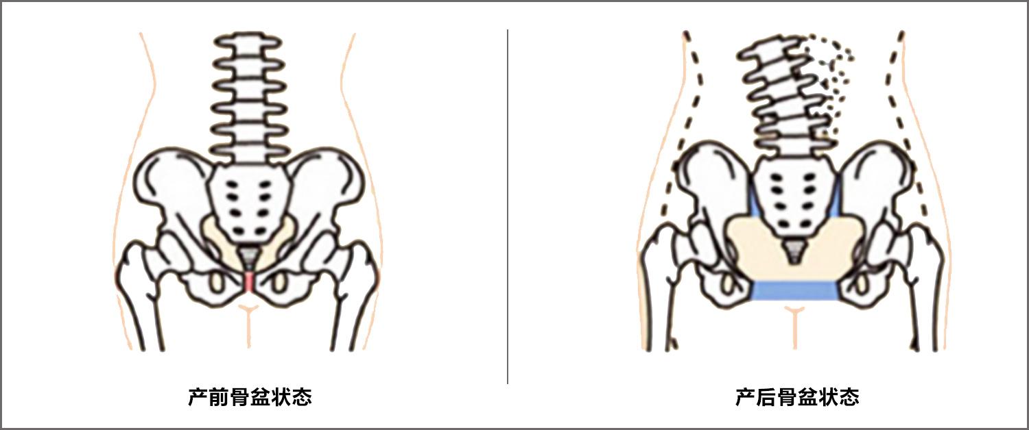 在激素的影响下,骨盆中的耻骨联合和骶髂关节的稳定性会变差,变得松弛。这种松弛在妊娠的上半期就已经开始了,在妊娠最后3个月更加严重。正是因为妊娠期骨盆关节韧带松弛,妊娠末期耻骨联合会增宽5mm左右,但在分娩后立即开始消退,一般在产后3个月~5个月可完全消退。
