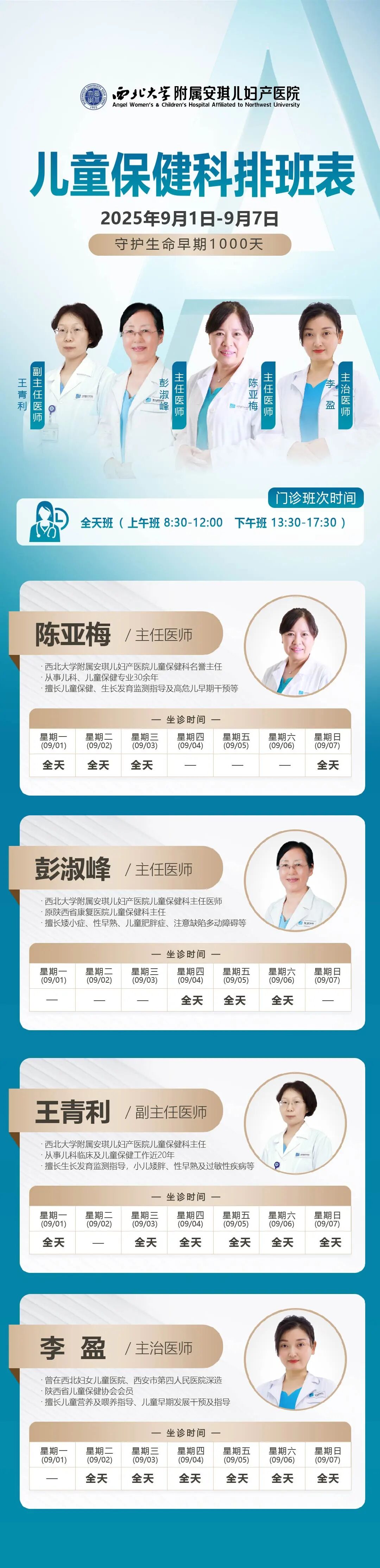 西安安琪儿妇产医院(9月1日至9月7日)专家坐诊时间表