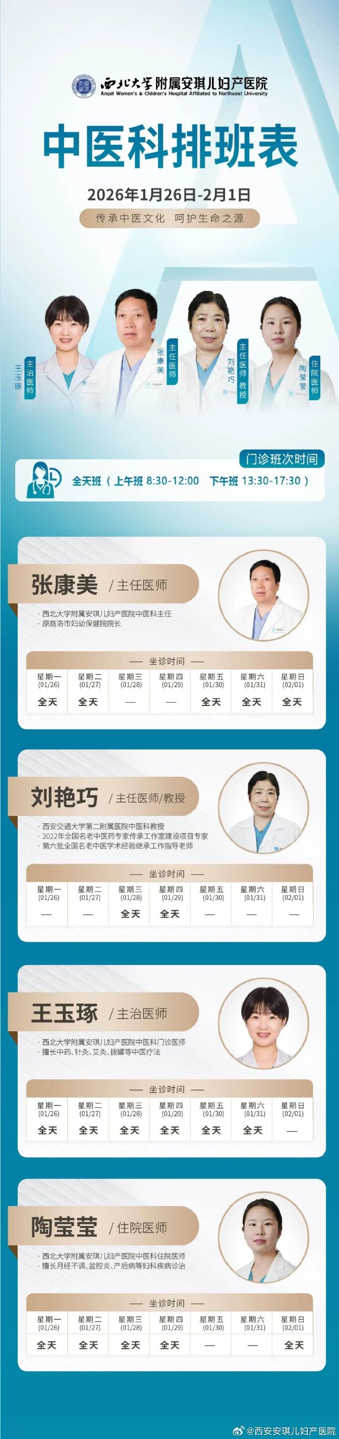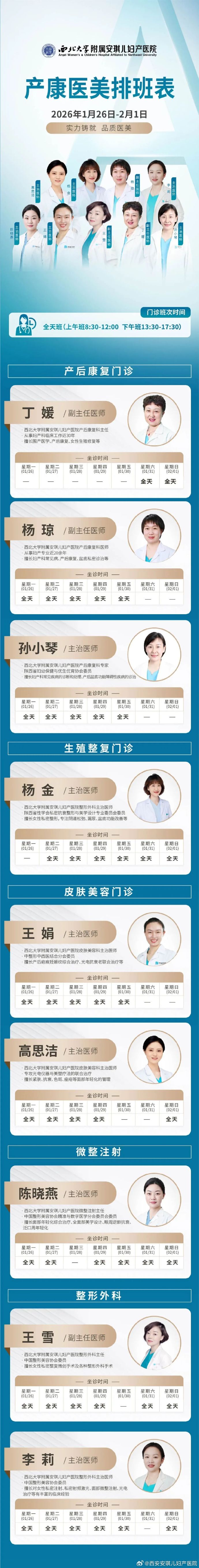 西安安琪儿妇产医院(1月26日至2月1日)专家坐诊时间表
